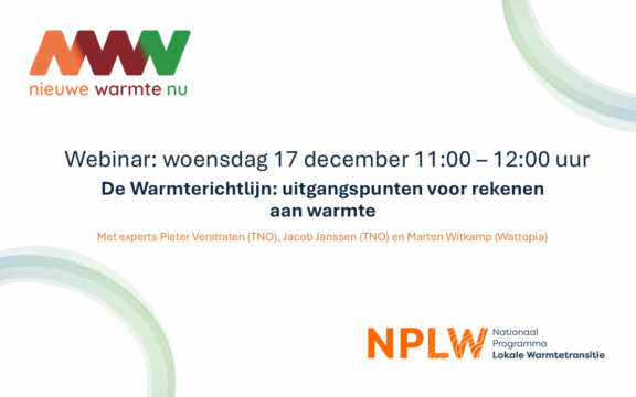 Met de Wet collectieve warmte (Wcw) verandert er veel. Daarom organiseerde het Nationaal Programma Lokale Warmtetransitie (NPLW) een reeks webinars over de Wcw met verschillende warmtepartners, waaronder Nieuwe Warmte Nu. De belangrijkste inzichten en praktijkvoorbeelden uit de zeven webinars zijn nu door NPLW gebundeld in een e-magazine.